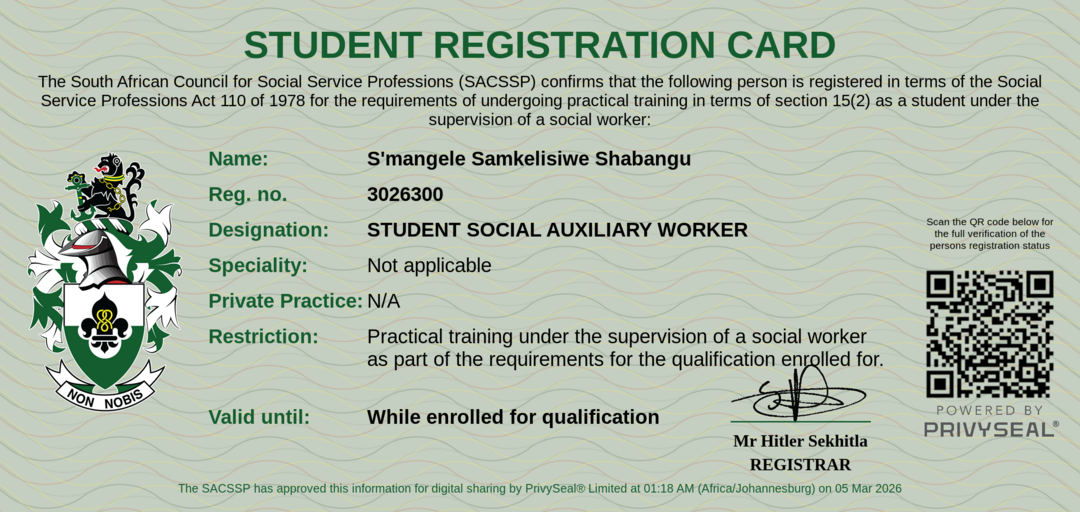 Membership Certificate: https://certificate.sacssp.co.za/a25401d3-3548-48fa-8838-8019cfe44e36
