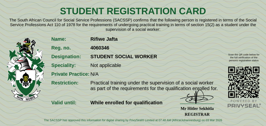 Membership Certificate: https://certificate.sacssp.co.za/b8d2684f-cc21-4d7d-9026-33040443a785
