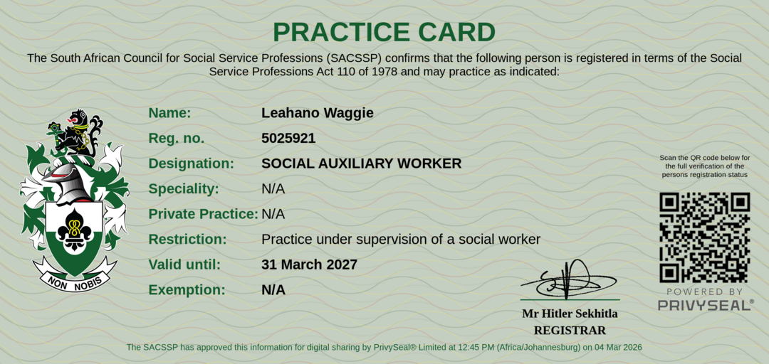 Membership Certificate: https://certificate.sacssp.co.za/655ba3b2-97e3-4a81-b249-f5ad58a3d99c
